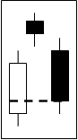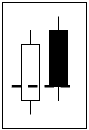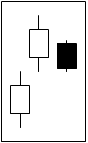 Dark Cloud Cover (Kabuse)A dark cloud candlestick formation consists of 2 days. The first is a strong, white real body, and the second is a black body, in which the close occurs in the lower half of the previous white real body. Its bearish connotations are most pronounced during an uptrend or in the upper part of a congestion zone (Pring 2002). |