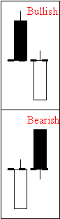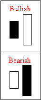 Engulfing Pattern (Tsutsumi)This formation develops significance after a prolonged price move (Pring 2002). A bullish engulfing pattern occurs when prices open lower than the previous day's close and then rally to close above the previous day's open. Thus, the current day's white real body "engulfs" the prior day's black real body. Note that only the real body is important in this pattern; both upper and lower shadows (i.e. vertical lines) are ignored. Bearish engulfing pattern is the opposite of the bullish engulfing pattern. |