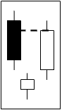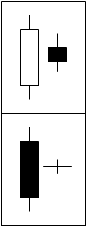 Harami Lines (Yose)Harami formation is similar to the consolidation trendline break in that it indicates a loss of momentum. The main difference is that harami lines are of much shorter duration and consist of 2 days' price action. The second one, the harami, forms a real body that is sufficiently small to be engulfed by the prior day's long real body. If the harami is also a doji, it is called harami cross (Pring 2002). After a sharp rally or reactions, these patterns indicate a balance between buyers and sellers after one or the other has predominated. This means that harami often warn of an impending trend change. In some instances, this will be from up or down to sideways and in others an actual reversal (Pring 2002). |