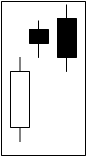 Upside Gap Two Crows (Narabi Kuro)This bearish formation consists of a long white body followed by two black bodies. The first black body gaps to the upside of the long white body. The third black body often closes the gap (Pring 2002). |