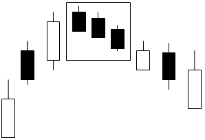 The three black crows pattern consists of three declining black candlesticks that form after an advance. They indicate lower prices. Each black candles should open within the real body of its black predecessor and close at or close to its session low (Pring 2002).