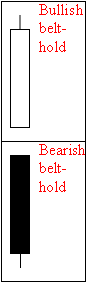 Belt-Hold Lines (Yorikiri)A bullish belt-hold is a one candle pattern consisting of a long candle in which the price opens on the intra-day low and then works its way higher throughout the session. The price does not have to close at the high, but the longer the real body, the more positive the candle. Also, if a belt-hold has not appeared on the chart for quite a while, it is therefore an unusual phenomenon. As a result, it gains in importance. This is because traders are making a very strong statement about their feelings towards the market with a belt-hold compared to the smaller candles that were previously a norm. Just think of a crowd murmuring, and then a loud voice comes from within the crowd. It is obviously a person who wants to be heard. The belt-hold following a long period of smaller candles amounts to the same thing. It is a one-day pattern that says loudly, "Listen to me because I am telling you, the short-term trend has changed" (Pring 2002). A bearish belt-hold is the opposite. |