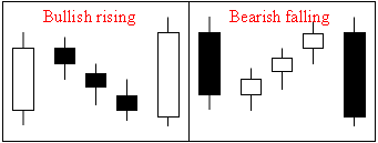 These formations are very similar in concept to a flag formation, except that they take only a few days, not weeks, to develop. The rising three method is a bullish pattern and consists of a powerful white body followed by a series of three or four declining small black bodies. These bodies should be accompanied by a noticeable contraction in volume that a very fine balance is developing between buyers and sellers. The final part of the pattern is a very strong white body that takes the price to a new closing high. This final day should record a significant increase in activity (Pring 2002).