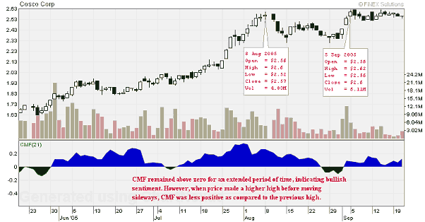 When Cosco rallied to a higher high on 5 September 2005, CMF was relatively less positive than the CMF on its previous high. Though CMF had generally remained above zero for an extended period of time, this signaled weak buying. Notice the sideways price movements that follow.